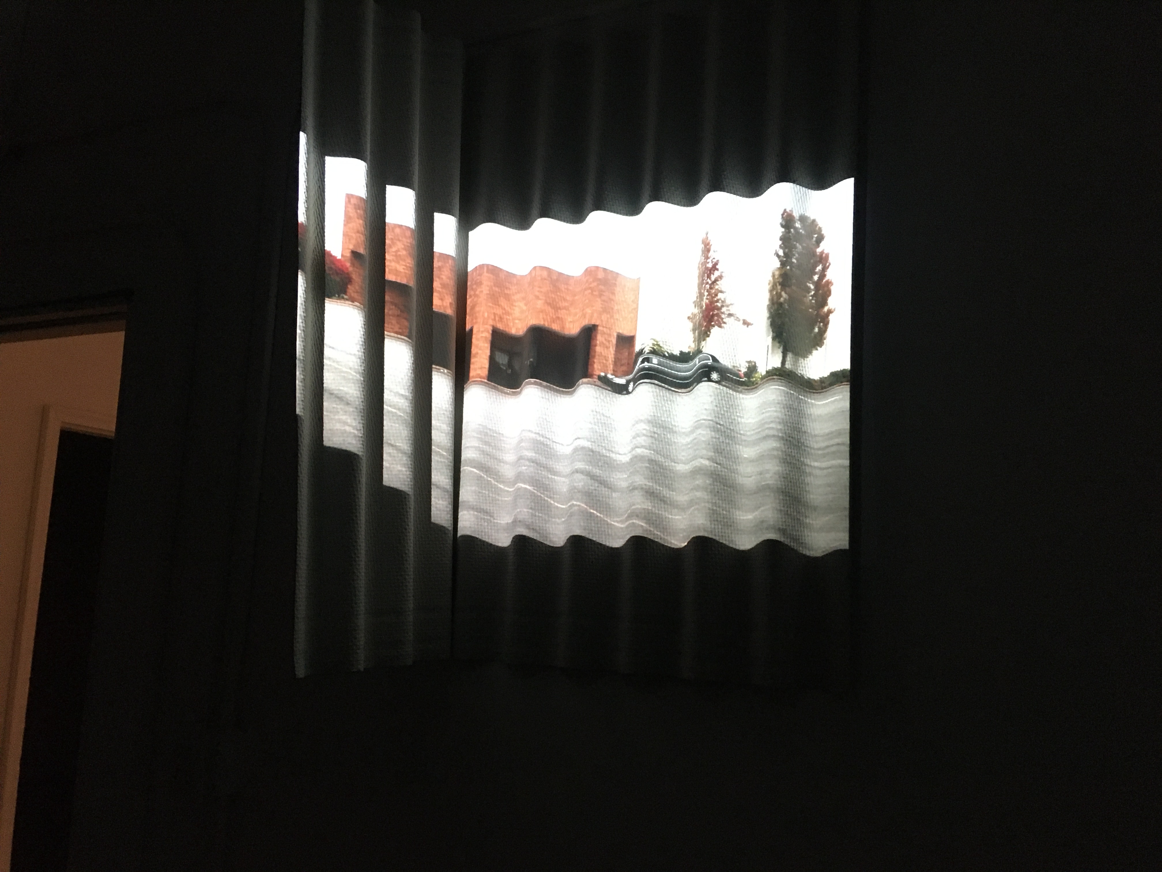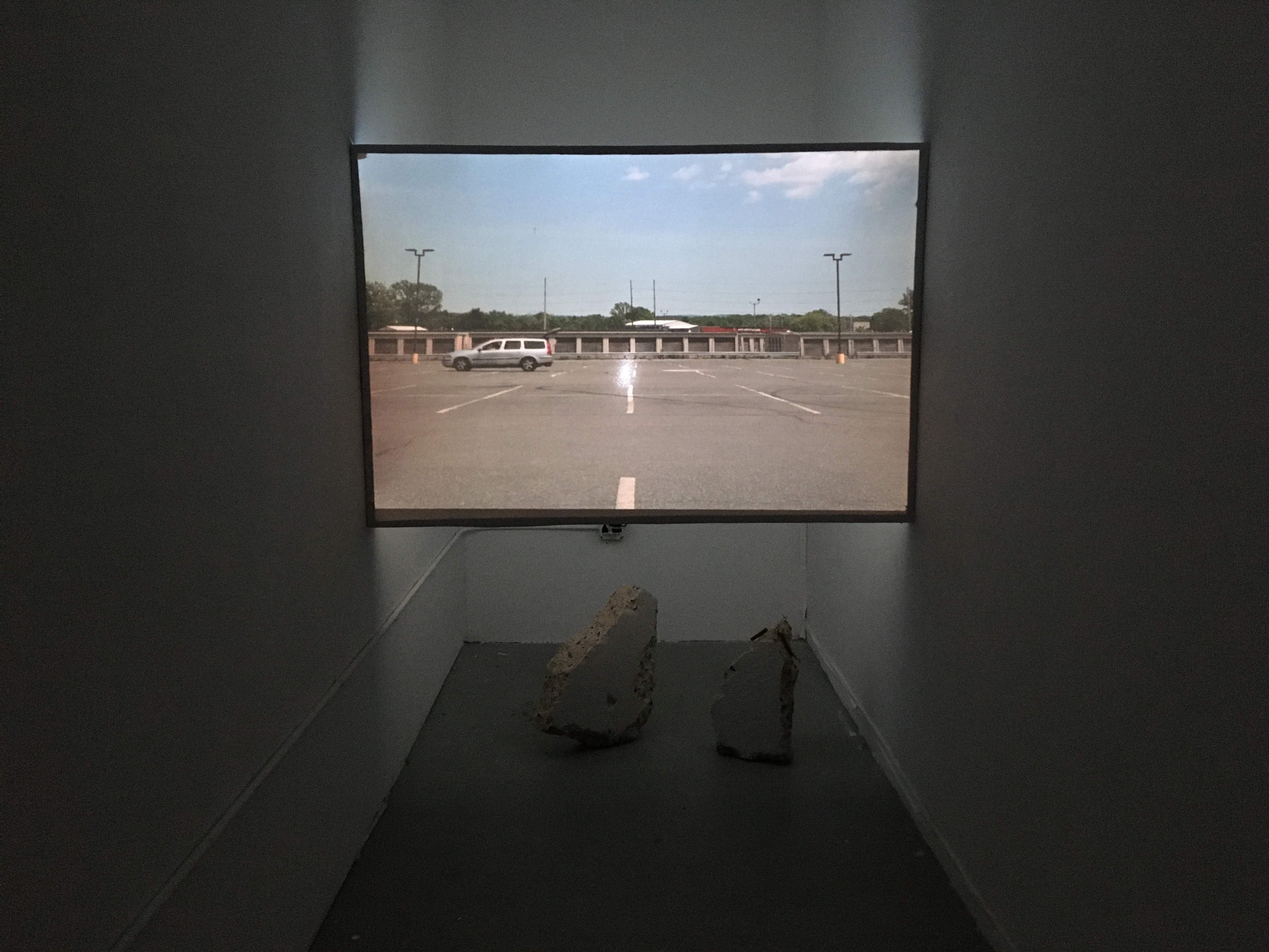 A three channel video installation. Channel 1 projected onto blackboard with bells affixed to it. Channel 2 spandex screen wedged between two walls. Channel 3 Limo video projected onto roofing material.