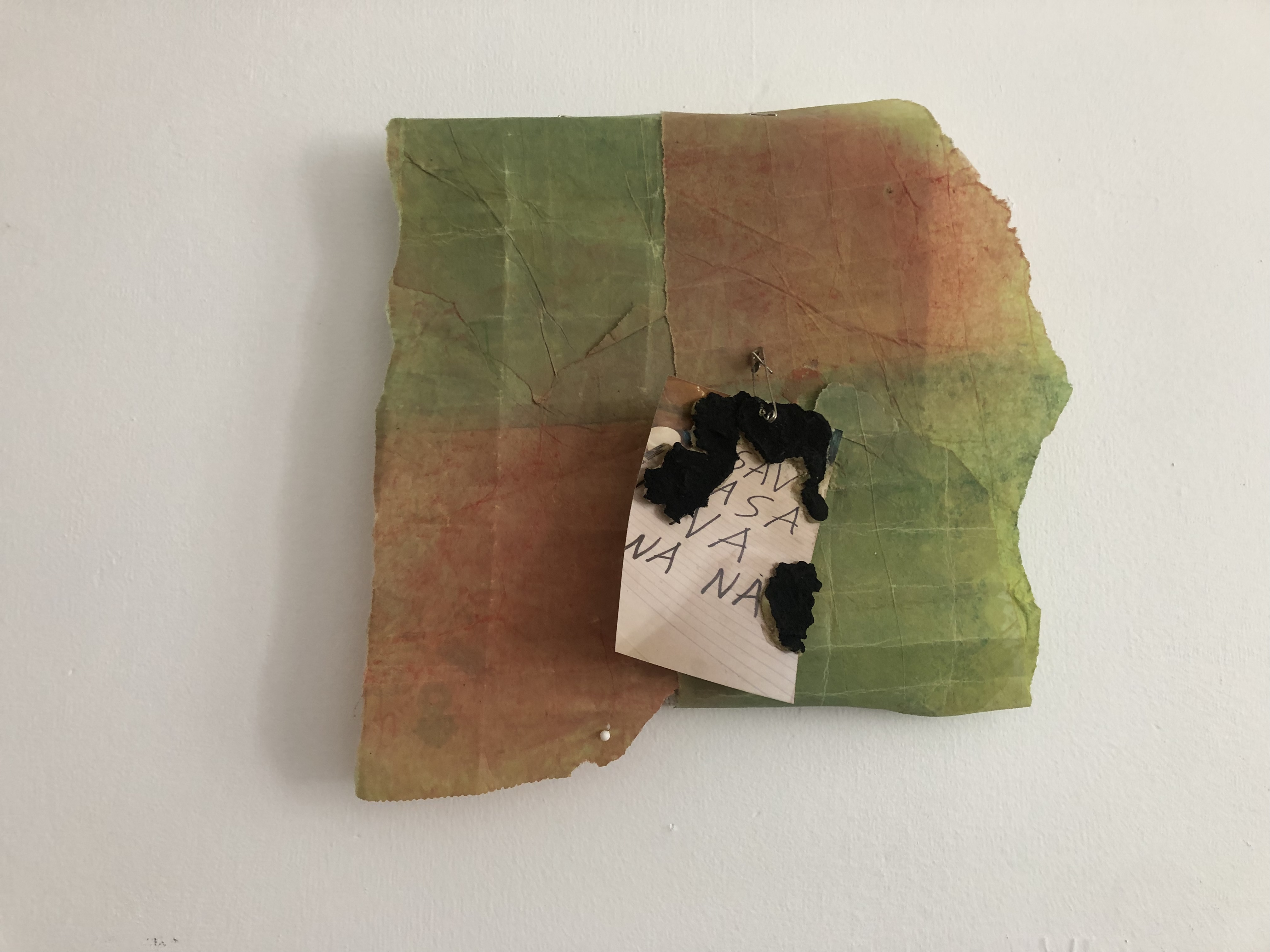 A frame is made of ceramic glazed buff, a piece of tracing paper fills the frame, a piece of yellowed old transparency film is spray painted with dots. Handmade paper colored red and green covered in wax with savasana nanana print attached. Photo from Audubon book “hermit crab has no housing problem” & “beach fleas feed on rotting seaweed” printed on cotton then covered in wax and adhered to glass.
