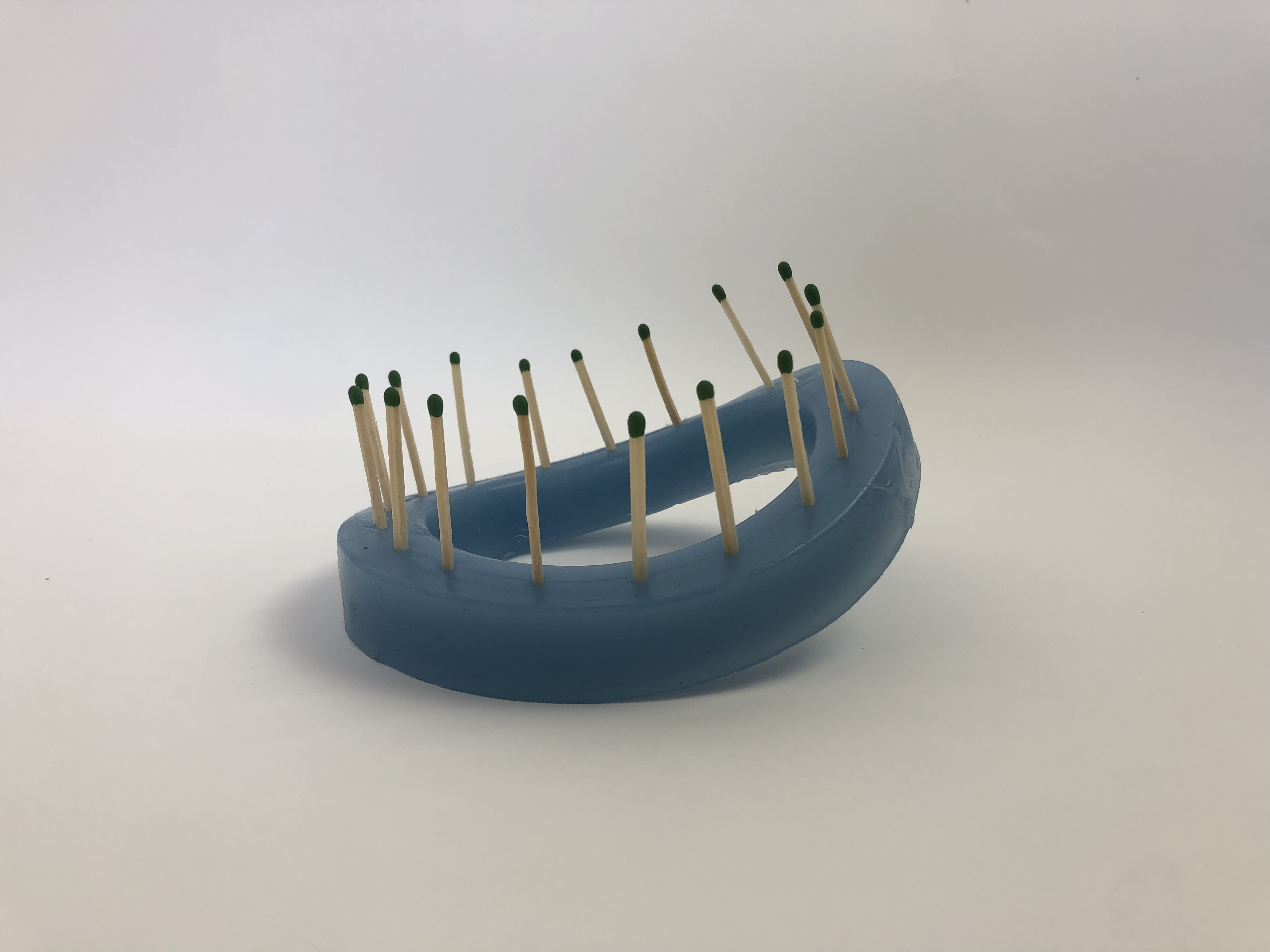 A brick is placed inside of a yellow compression sock. A toilet ring has matches placed in it. office art, 2020