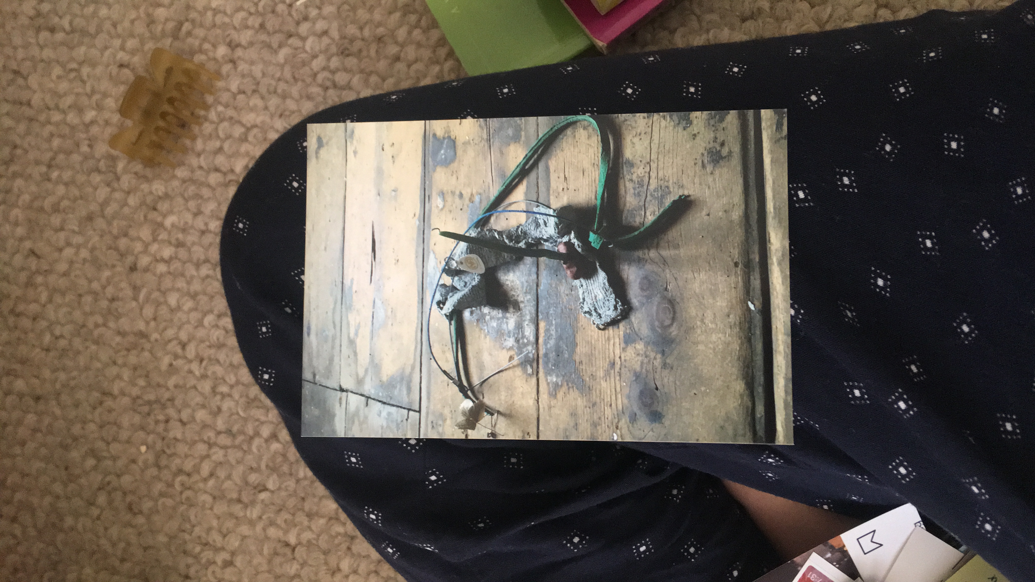 Black bleached tee with blue pastel & tiny brick, from Blue Hole, New Jersey (attached with red string)
